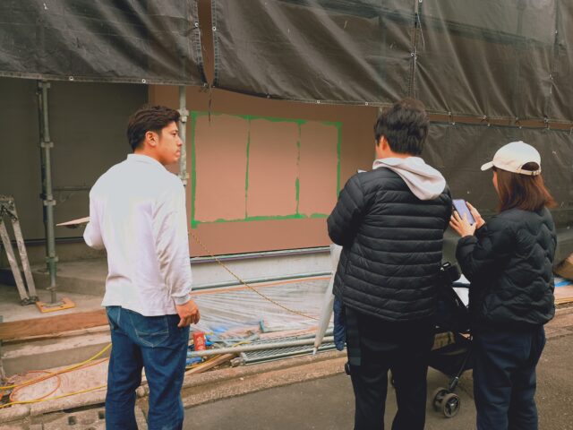 今日は施工中のH様邸にてお客様と職人さんと私で立ち会い塗り壁のパターンを決定していただきました。